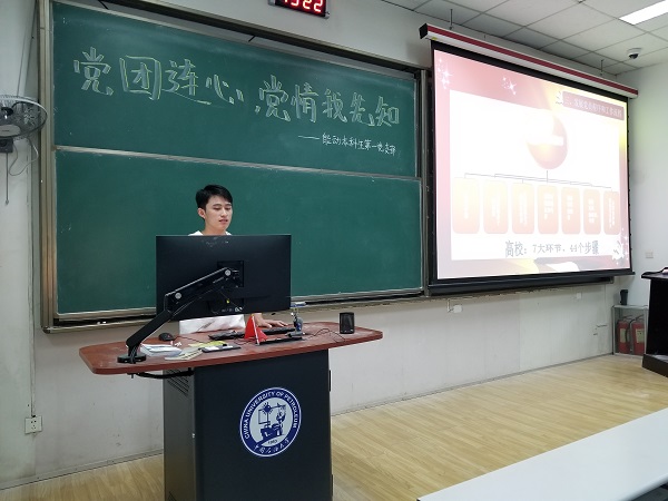 活动伊始,能动1901团支部书记马胜祥介绍了活动流程。然后,冯文创同志为大家详细介绍了共产党的历史使命等相关信息以及入党发展流程,同学们认真学习了冯的讲解并提出问题,冯详细回答了新生们的问题。随后,袁晶同志讲述了自己进入大学两年多来的学生工作经验,其播放的“点赞中国”手指舞视频也让大家受到吸引。在讲解中,“如何进行学生工作”,“如何做好学生工作”等问题也迎刃而解。结束时,袁感慨道:“虽然团支书的职务我只担任了一年,但这让我收获颇丰,参加学生工作也是大学生活极为重要的一部分!”接下来,陈亚春同志给大家进行了能动专业的专业介绍,为19级的新生上了关于专业认识的一堂课。而后,杨耀钧、杨程翔、辛宇、李豪等同志分别为大家分享了保研经验,让新生对于未来的方向与脚下的路有了更明确的规划。最终由能动1902团支部书记王恩礼进行了活动总结,活动圆满结束。