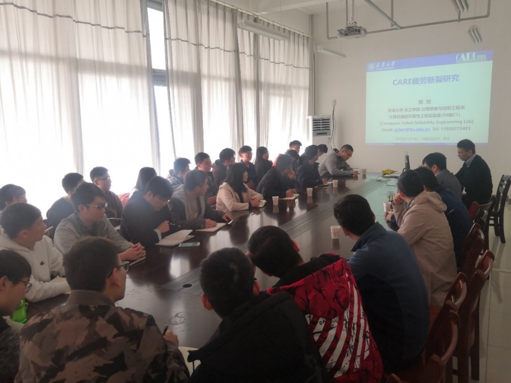会议伊始,蒋文春副院长介绍了陈旭教授在结构完整性所获得的成就和研究成果。随后,陈旭教授给装控系师生做了一场精彩的报告,他首先回顾了天津大学化工过程机械学科的发展历史,指明与中国石油大学有着很好的历史渊源。接下来,陈旭教授对个人研究团队CARE(计算机辅助可靠性工程)实验室近年来所做的研究工作做了详细的介绍,主要包括多尺度环境耦合材料力学性能测试分析技术(低周疲劳、高周疲劳、热机疲劳、高温蠕变-疲劳、腐蚀环境疲劳等)、材料循环本构理论研究、结构循环塑性分析技术及复杂载荷下多轴疲劳寿命预测分析技术等。最后,在场的教师和研究生积极发言,与陈旭教授进行了热烈讨论。