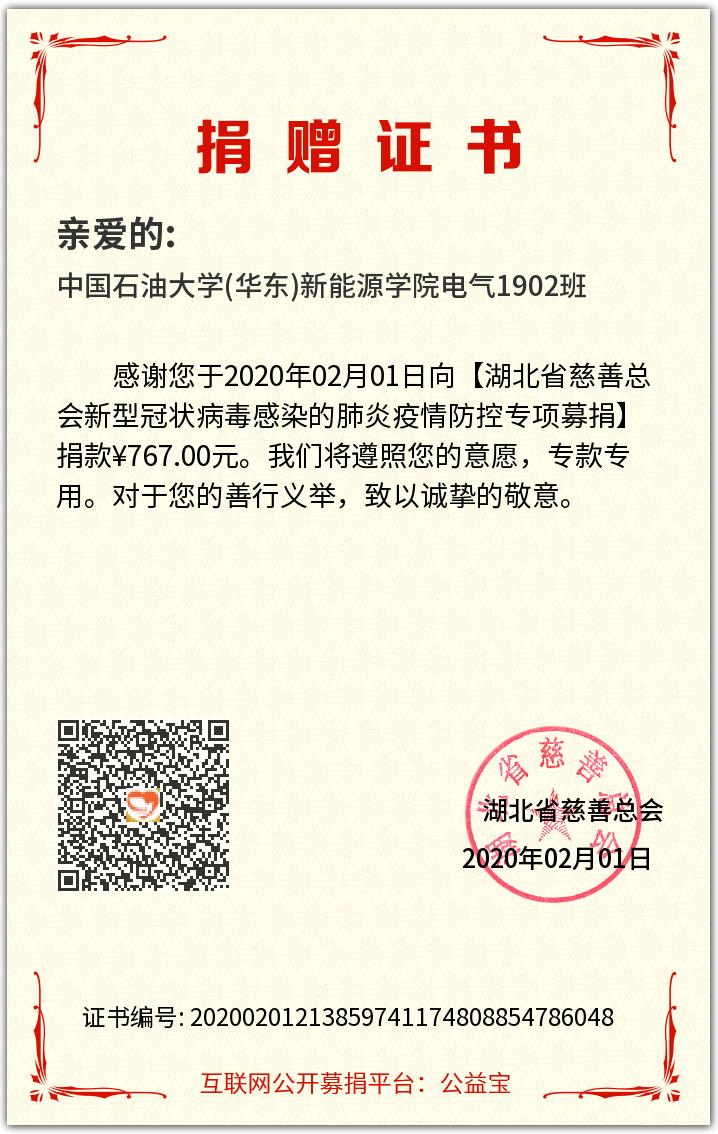 为争取早日控制肺炎疫情,2月1日,beat365官网电气工程及其自动化1902班向湖北省慈善总会新型冠状病毒感染的肺炎疫情防控专项募集了767 元,用于新型冠状病毒防治,湖北省慈善总会颁发电子证书以致敬意。