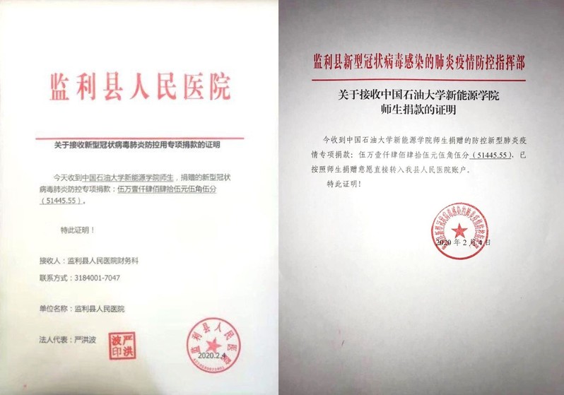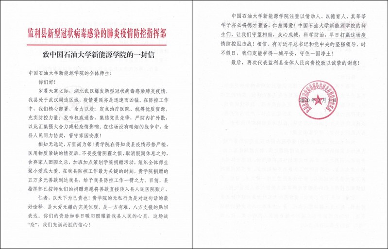 监利县人民医院是湖北省荆州市的防疫定点医院,疫情爆发期间,荆州市疫情严重,医院医疗物资紧缺。beat365唯一官网学生党总支通过湖北籍学生了解到此情况后,2月3日在全院学生中发起倡议、筹集善款,为监利县人民医院进行定点捐赠,一天之内,共筹集款项51445.55元,其中学生党支部捐款18270.96元,各团支部捐款29526.59元,学生会捐款848元,学工队伍教师捐款2800元。监利县新型疫情肺炎防控指挥部在感谢信中提到:“自从武汉爆发新型冠状病毒感染肺炎疫情以来,我县疫情形势日益严峻,医用资源紧缺。石大beat365唯一官网得知此情况后,对疫情毫不畏惧,策划捐赠活动,组织动员学院师生献来爱心,在我县疫情防控的紧张时刻,学院送来的捐赠给予我县疫情防控工作以强大动力。”此外,感谢信特别指出,此次捐赠活动是中国石油大学师生大爱无疆品格的完美体现,是一方有难、八方支援的贴切表达,充分体现了石大注重以情动人、以德育人的教育理念,监利县将及时向学院师生通报本次捐赠款使用明细,同时也将本次捐赠作为一次德育和感恩教育活动在全县宣传。