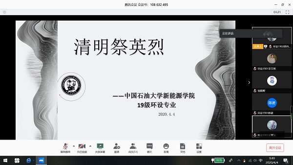 上午10点,警报长鸣,全体学生以三分钟默哀向革命先烈致以悼念。随后,主持人胡沛语带领参会人员以观看视频的形式,学习并致敬驰援武汉的时代英雄。“愿逝者安息,国家昌盛”,环设1902班张清华道。接下来,参会学生以“英雄,我想对您说”为主题,以手写感悟并发表在QQ群里的形式抒发自己对参与抗战及新中国成立的革命先烈的敬畏之情。紧接着,环设1902班班长陈晓哲对英雄人物事迹进行分享。他通过列举胡信之,王尽美等革命先烈的感人事迹,赞扬了他们对民族独立做出的突出贡献,“我们都要学习他们临危受命,逆风而行的担当。”学生在聆听完胡沛语和陈晓哲的分享后纷纷抒发了对逝去英雄的缅怀、对当下勇士的敬畏进而引出对个人价值的思考,并分享自己的个人目标。