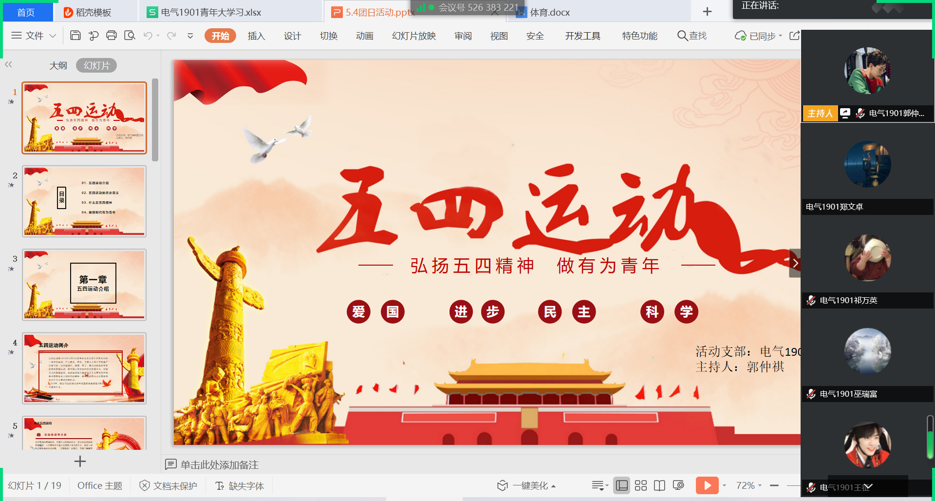 beat365官网电气工程及其自动化专业1901班于5月4日开展主题为“弘扬五四精神,争做有为青年”的团日活动。受疫情影响,本次活动于“腾讯会议”线上平台进行。