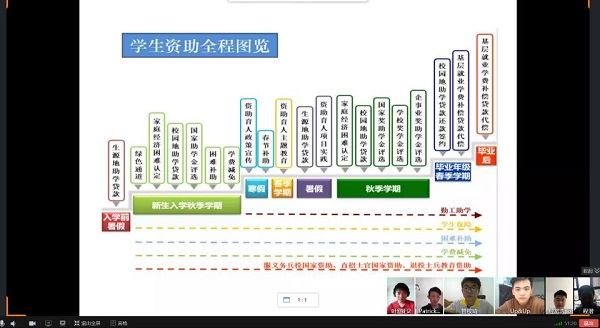 开展线上资助政策宣传活动。疫情无情人有情,学生资助宣传大使李红雨、程小双和管桉琦3名同学分别在线上开展了资助政策宣讲会,他们通过钉钉直播平台和QQ直播平台,结合亲身经历,详细介绍了国家及我校奖助学金、生源地助学贷款、勤工助学和学费减免等多项资助项目的申报条件和申报程序,将各项资助政策与衣、食、住、行的各个方面都有机结合起来,让寒门学子打消经济上的顾虑。