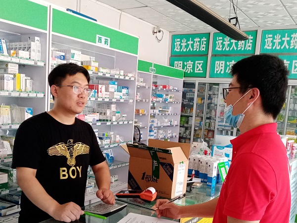 图为实践队队员对药店工作人员进行采访