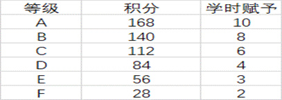 打卡积分与社会实践学时对应关系如下(从F至A依次递增):