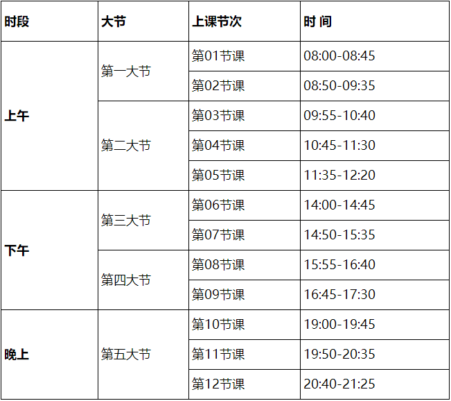 1.上课节次调整为:上午5节,下午4节,晚上3节,共12小节,五大节。每小节上课时间调整为45分钟,小课间休息5分钟,大课间休息20分钟。
