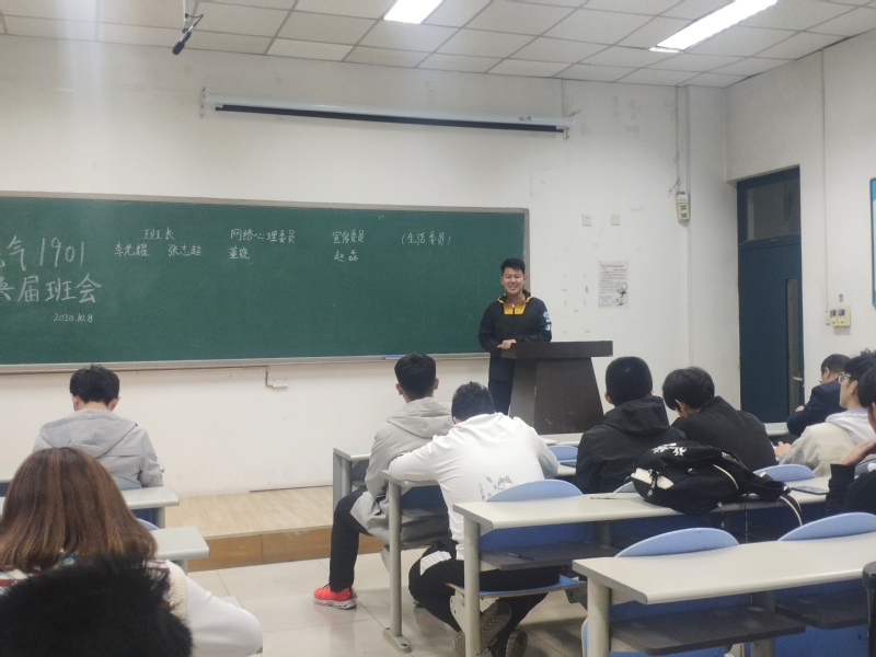 本次会议由电气1901团支部团支书王彤辉主持,并邀请班主任陈荣出席会议。由于进入大二新学期,班级内部事务产生阶段性改变,并根据原班级干部自身学习与业务能力原因,本次会议旨在调整班内干部任职情况并总结大一学年班级事务完成情况。本次选举采取匿名投票的方式,选举结果如下:班长职务改为由张志超接任,网络心理委员、宣传委员与生活委员分别更换为董晓、赵磊和李少锋。选取完成后,王彤辉就大一学年我班在学习和学校事务方面所取得的成就与缺陷进行了简要总结,并表彰了部分有出色表现的学生。会议期间,陈荣有感而发:“希望新任班级干部能够接替好自己点的职务,并在保障学习的情况下能够提高自身业务能力,并通过挑战任职班干部的方式培养自己所不足的能力与责任心。”会末,就大二学年更加繁重的学业任务和学校事务,团支书强调时间分配和学业占比两方面,他强调学生应该以学业为第一要义,在保障成绩的基础上进而在一定程度上发展自身特长,开拓视野眼界。