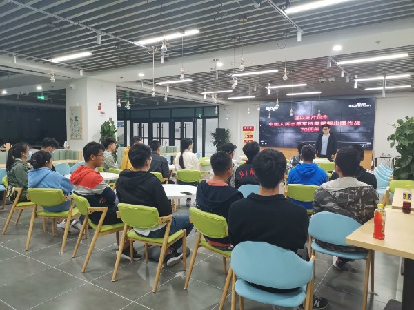 活动伊始,2019级兼职辅导员于振兴为大家介绍本次活动的意义及目的,强调抗美援朝及抗美援朝精神对党的重大历史意义和重要价值。随后,全体成员通过观看视频重温中国共产党领导抗美援朝战争的光辉历程,体会全国各族人民同仇敌忾、众志成城的家国情怀,以及中华民族不畏强暴、维护和平的坚定决心,并进行热烈的讨论。2019级发展对象赵丹说到:“和平来之不易,在争取民族独立、人民解放、祖国安宁的道路上,无数革命先辈和抗战战士前仆后继、顽强奋斗,用鲜血和生命铸就了永不褪色的精神丰碑,我们要更好地继承先烈遗志,在和平时代为建设祖国作出应有贡献。”