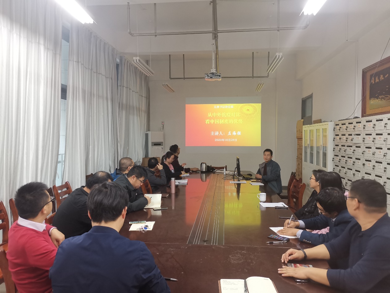 1028日下午,装控系党支部在工科楼E411党员之家开展主题党日学习教育活动。活动第一项内容由支部书记左海强主讲题为“从中外抗疫对比看中国制度的优势”的微党课。通过分析中外抗击新冠肺炎疫情过程中的不同做法和取得的成效从道路自信、理论自信、制度自信和文化自信四个方面阐述了中国特色社会主义制度的优势。病毒没有国界,疫情不分种族。在这次战“疫”斗争中,我们党始终把人民群众生命安全和身体健康放在第一位,体现了党对人民健康高度负责的情怀与担当。