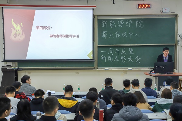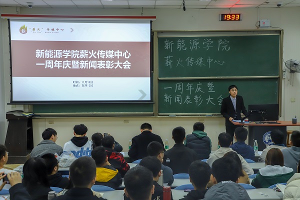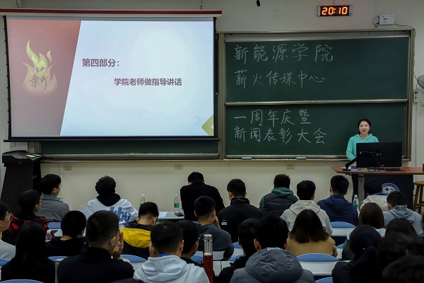 此次薪火传媒中心一周年庆分为“介绍薪火传媒中心简介”、“各宣传组织工作汇报”、“先进组织及个人表彰”以及“领导总结讲话”四部分进行。会议伊始,丁元贺介绍薪火传媒中心组织简介及换届情况。他对薪火传媒中心各部门的运营范围及运营方式进行讲解,并对薪火传媒中心2020-2021年届主席团及部级骨干选拔结果进行公示。随后,源远通讯社、学生会宣传部等各宣传部门负责人从部门构架、工作成果及未来规划等方面进行工作汇报。接着,穆海涛宣读获奖表彰名单,各辅导员为新闻宣传先进集体及新闻宣传先进个人、优秀学生记者等获奖组织及个人颁发获奖证书并进行合影。会议最后,穆海涛、郭晓静做总结发言。穆海涛对薪火传媒中心成立一周年表示祝贺,并对各个组织及成员为学院宣传工作做出的贡献表示肯定。他表示,希望在以后的工作中各宣传组织及个人进行沟通交流、互相学习。郭晓静切开薪火传媒中心一周年生日蛋糕。至此,薪火传媒中心一周年庆暨新闻表彰大会结束。