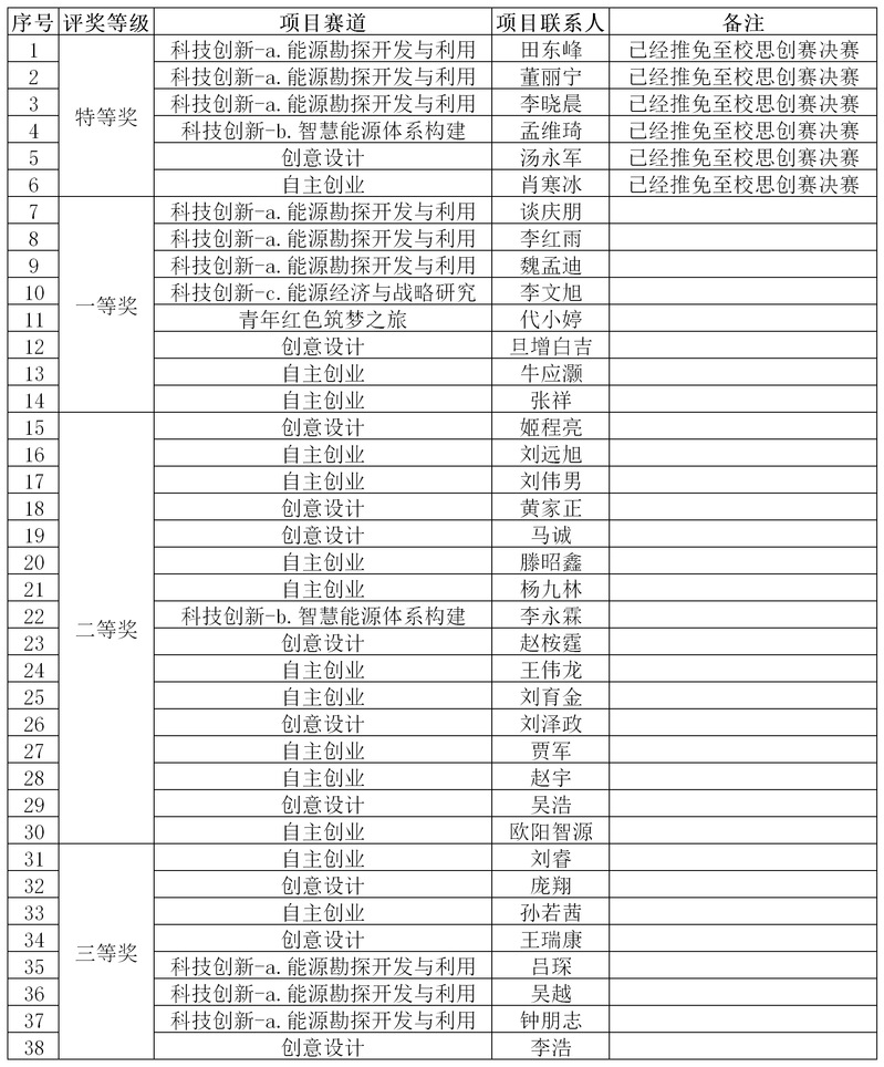 2020年“未来杯”思创赛已圆满落下帷幕。本次思创赛,新能源学院共报名参赛79项。学院结合学校初审意见,组织教师对科技创新比赛、自主创业比赛、青年红色筑梦之旅等参赛项目作出评审,共选出院赛特等奖6项,一等奖8项,二等奖16项,三等奖8项。评审结果见下表。