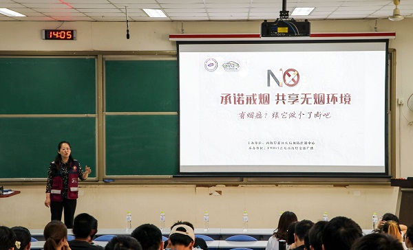 活动伊始,霍玲玲围绕“承诺戒烟,共享无烟环境”主题,讲述“吸烟的危害”“我国控烟形势严峻”“控烟在行动”三大内容,重点讲述吸烟的危害,通过具体数据与案例,劝诫大学生放弃吸烟,并向每一位吸烟的大学生提出戒烟的方法,鼓励有烟瘾的学生去医院寻求专业医生的帮助。紧接着,徐燕以“遏制结核,志愿有我”为主题,分析我国及黄岛区学校的结核病的形势和发病率提高的原因,讲解结核病的症状和危害。随后,她呼吁全体学生关心肺结核患者,用实际行动去帮助患者,协助他们共克困难。最后,徐燕讲述大学生志愿参加医疗活动的意义和志愿帮助患者的技巧,并鼓励全体学生参加到志愿活动中去。