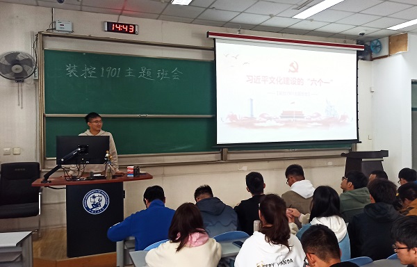 为深入学习习近平文化建设的“六个一”,加强班级社会主义文化建设,过程装备与控制工程专业1901班于10月18日在讲堂群西环302室开展学习“六个一”主题班会,本次会议由班长任子淳主持,装控1901班全体成员参与。