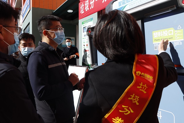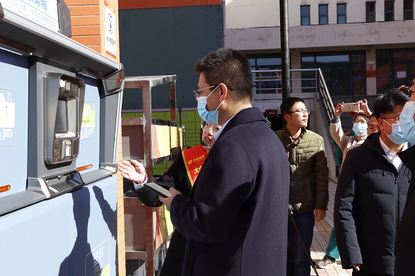 党委学生工作部(武装部)部长王林 体验垃圾分类投放箱 杨新宇摄