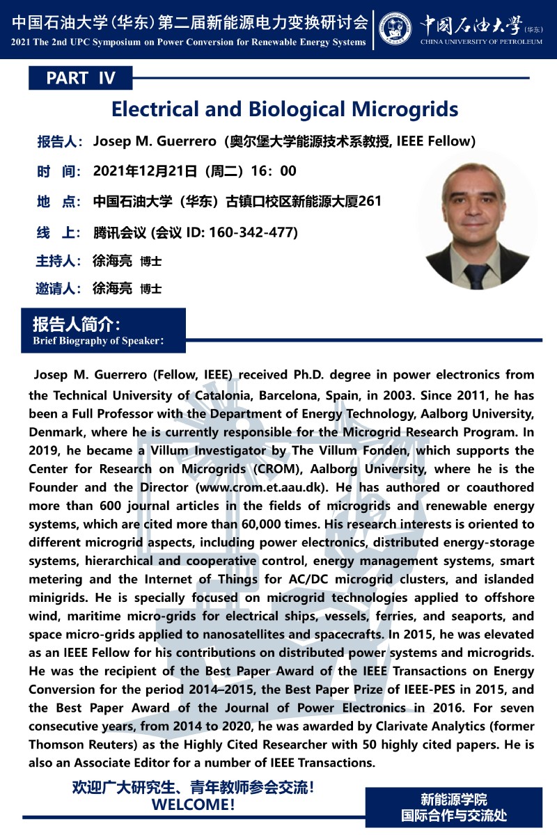 关于第二届新能源电力变换研讨会之丹麦奥尔堡大学Josep M. Guerrero教授讲座的通知