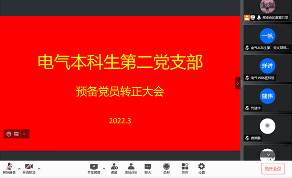 3月13日,电气工程及其自动化专业本科生第二党支部举行预备党员转正大会。此次大会由于疫情原因在线上举行,由党支部书记郑卓良主持,支部全体正式党员和预备党员参与此次会议。