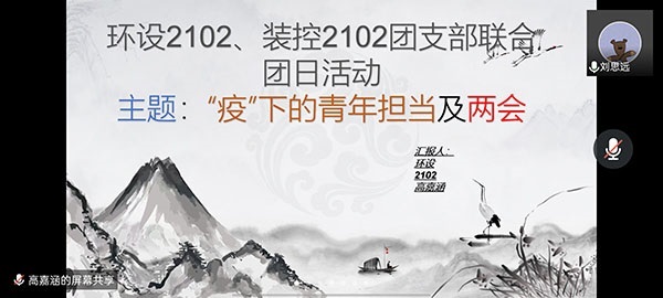 为切实做好我校针对防控的各个环节、各类工作的宣传工作,同时让学生了解、关注更多两会内容。环设2102班、装控2102班于3月26日晚在腾讯会议联合开展“‘疫’下的青年担当暨学习两会精神”主题线上团日活动。本次活动由装控2102班团支书李家驹主持,环设2102班团支书高嘉涵主讲,两班全体成员参加。