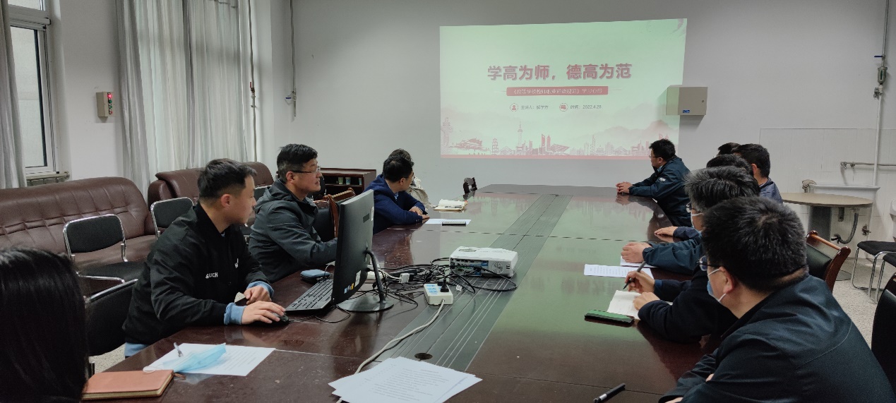 接下来,支部开展了师德专题学习教育活动,青年教师解学方老师结合自身实际,与大家一起分享了学校青年教师岗前培训《高等学校教师职业道德规范》的学习心得《学高为师,德高为范》。全面解释了作为高校教师职业道德规范“爱国守法、敬业爱生、教书育人、严谨治学、服务社会、为人师表”的内涵和要求。左海强带领支部全体党员教师学习了习近平总书记4月25日在中国人民大学考察时的重要讲话精神,要求全体教师要始终坚持党的领导,坚持马克思主义指导地位,坚持为党和人民事业服务,落实立德树人根本任务,传承红色基因,在教书育人过程中明确“为谁培养人、培养什么人、怎样培养人”这一根本问题。