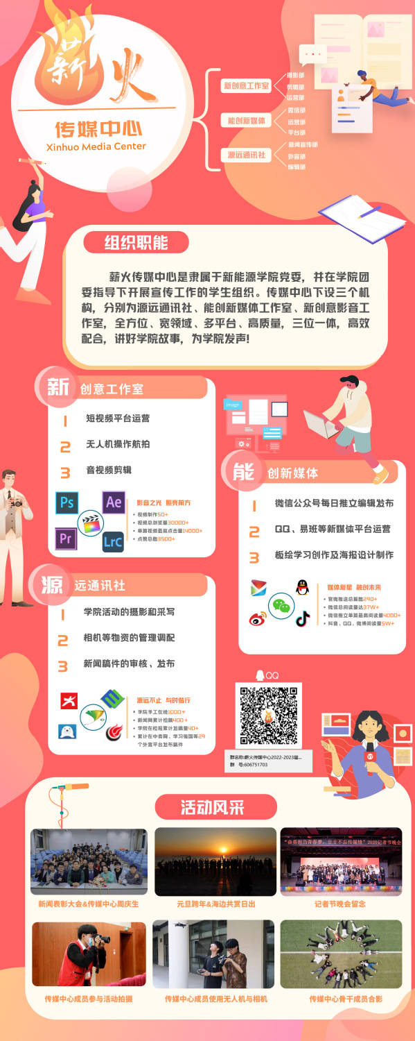 薪火传媒中心是隶属于beat365唯一官网党委,并在学院团委指导下开展宣传工作的学生组织。传媒中心主要划分为新创意工作室、能创新媒体工作室、源远通讯社三大部门。肩负着学院教工及学生活动的新闻宣传任务,是展现学院风貌的窗口。为更好开展中心工作,现面向beat365唯一官网2020、2021级本科生公开选拔beat365唯一官网薪火传媒中心2022-2023届主席团及部级骨干成员。