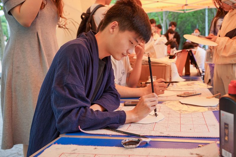 书法体验摊位上,学生会提供了团扇和书签,供学生自由书写,以展现书法成果。众多学生参与并写下祝福、诗句等。同时,书法摊位也展出了书法比赛的优秀作品以及书画社精美的篆刻、国画作品。学生在欣赏优秀作品的同时也能动手体验了书法的乐趣,有利于提高书法水平,领悟书法魅力。