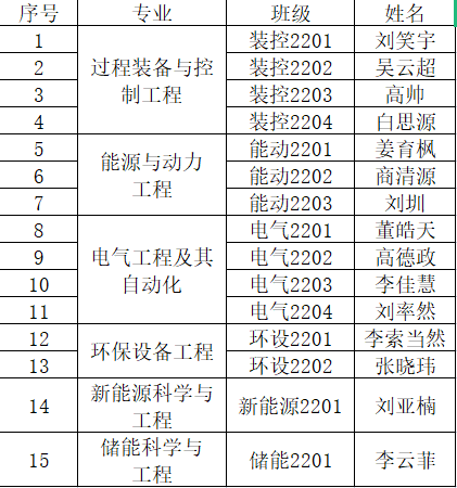 根据新能源学院《关于开展2022级班主任助理选聘工作的通知》及2022级各专业班级情况,经学生自主申报、答辩考核,拟确定以下15名同学担任2022级新生班主任助理,现将名单公示如下: