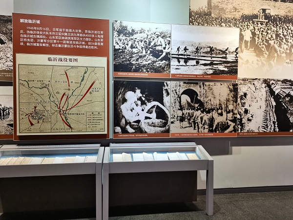 沂蒙革命纪念馆位于华东烈士陵园北侧,寄托了沂蒙人民对民族革命的历史怀念,实践队沿二楼展厅逐一参观——整个展览主题鲜明,展陈丰富,陈列着沂蒙革命战中双方序列、战场战报、殉难将士名录、革命期间红区宣传报纸等历史文化展品。展厅后方是一座座铜制雕像——一位位百姓推着独轮车,奔走向前线。介绍中提到,该雕像描绘了淮海战役时期,沂蒙人民用行动创造出一条红军的生命线。华东野战军司令员陈毅曾发出赞叹:“淮海战役的胜利,是人民群众用小车推出来的!”。