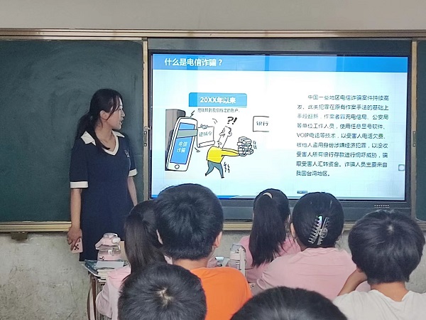 活动伊始,杜晓钰首先提出“反诈骗要从娃娃抓起”的观点,进而通过分析一个小学生受骗实际案例来作证,小学生社会阅历浅,防范能力、警惕心理不强,容易成为犯罪分子的目标。随后杜晓钰讲解了电信诈骗的定义、特点及应对方法,对于电信特点的部分,她提醒参会人员由于当代通讯技术的不断进步,电信诈骗正在向“隐蔽性强”迅速发展,因而加强国民的反诈意识刻不容缓;随后,杜晓钰随机抽取两名学生进行了诈骗场景的模拟,以此让参会学生更直观地感受到诈骗犯罪分子的话术陷阱,同时向学生们讲授了应对话术的对策。杜晓钰向学生们说:“放松警惕就已经落入了诈骗犯罪分子的陷阱。”会议最后,杜晓钰鼓励参会学生积极向身边的家人传递今天所讲的反诈知识,营造“反诈就在身边”的氛围。会后,王迪说:“参加这次活动让学生们第一次认识到了反诈的重要性,对于学生维护自身合法利益、增强反诈意识意义重大。”