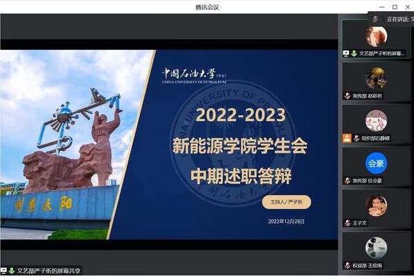 为坚持履行自我管理、自我服务、自我监督、自我教育的职责,发挥服务学生、引导学生、团结学生的积极作用,检验本学期工作成果,12月28日,beat365官网学生会开展线上2022-2023学年中期述职答辩。本次答辩由文艺部部长严子昕主持,学院团委书记穆海涛,辅导员骆浩冉、倪萌、王伟龙以及往届学生会优秀成员牛海锌受邀出席,全体学生会成员参加。