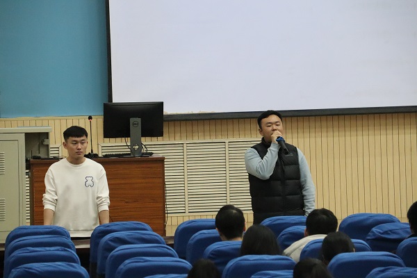 辅导员骆浩冉首先强调了学生干部的角色意识,要在思想、学习、实践等各个方面树立榜样,当好排头兵。针对学生的安全和宿舍卫生情况,他指出,“要将反诈骗意识和生命安全意识放在学习生活第一位,注意保持宿舍卫生,保证宿舍的干净整洁,防止春季传染病的传播,严禁晚归和夜不归宿的情况发生。”同时,他鼓励同学们走出宿舍、走向操场,学生干部要起带头作用积极参加体育运动,培养个人兴趣,增强体质、陶冶情操。随后,辅导员王伟龙就学风建设和心理健康进行发言,他指出,“班级学风是班级整体发展的‘晴雨表’,全体学生干部要紧抓自己班级的学风,关注好班级学生的学习,对学习困难和挂科比较多的同学进行补救关注,同时也要多注意同学们的心理健康,关心关爱同学,注重第二课堂的成绩,调整好个人心态,做好学习规划,珍惜在校时光,将大学生活过得更加充实。”