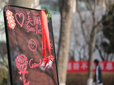 本次活动围绕“镜子”展开——参与者用口红,在镜子上写下自己的祝福与期许,寓意着“爱生活,更爱自己”的美好理念。镜子放置于创造太阳、荟萃广场、田径场、新图书馆等学校建筑处,并设有心愿贴纸、节日采访、思美问答等多个游戏。游戏简单有趣,增强了活动的趣味性,并与思美节息息相关,有利于学生了解思美节意义,增强学校归属感。