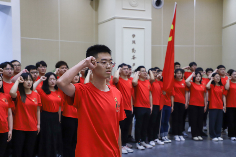 活动最后,吴明铂为2023届毕业生党员授旗,2019级装控与环设本科生党支部书记汤枢泽在党旗前带领全体毕业生党员重温入党誓词,一字一句都将深深刻在每一位党员心中,作为指引前行的灯塔。