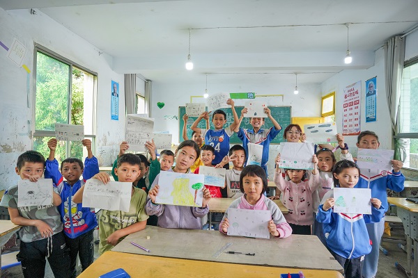 孩子们展示自己手中的作品,绽开最纯真的笑颜。老师寓教于乐,孩子们也在欢声笑语中感受到了绘画的乐趣,对基本的绘画有了更深入的了解,给他们带去希望、带去向往,拓宽他们的艺术视野。