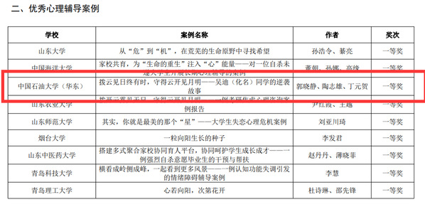 近日,山东省高等学校思想政治教育研究会大学生心理健康教育专委会公布《2023年山东省高校心理健康教育月展示活动评选结果》,由beat365官网辅导员郭晓静、陶志雄、丁元贺编写的心理辅导案例《拨云见日终有时,守得云开见月明——吴迪(化名)同学的逆袭故事》获本次评选活动心理辅导案例一等奖。