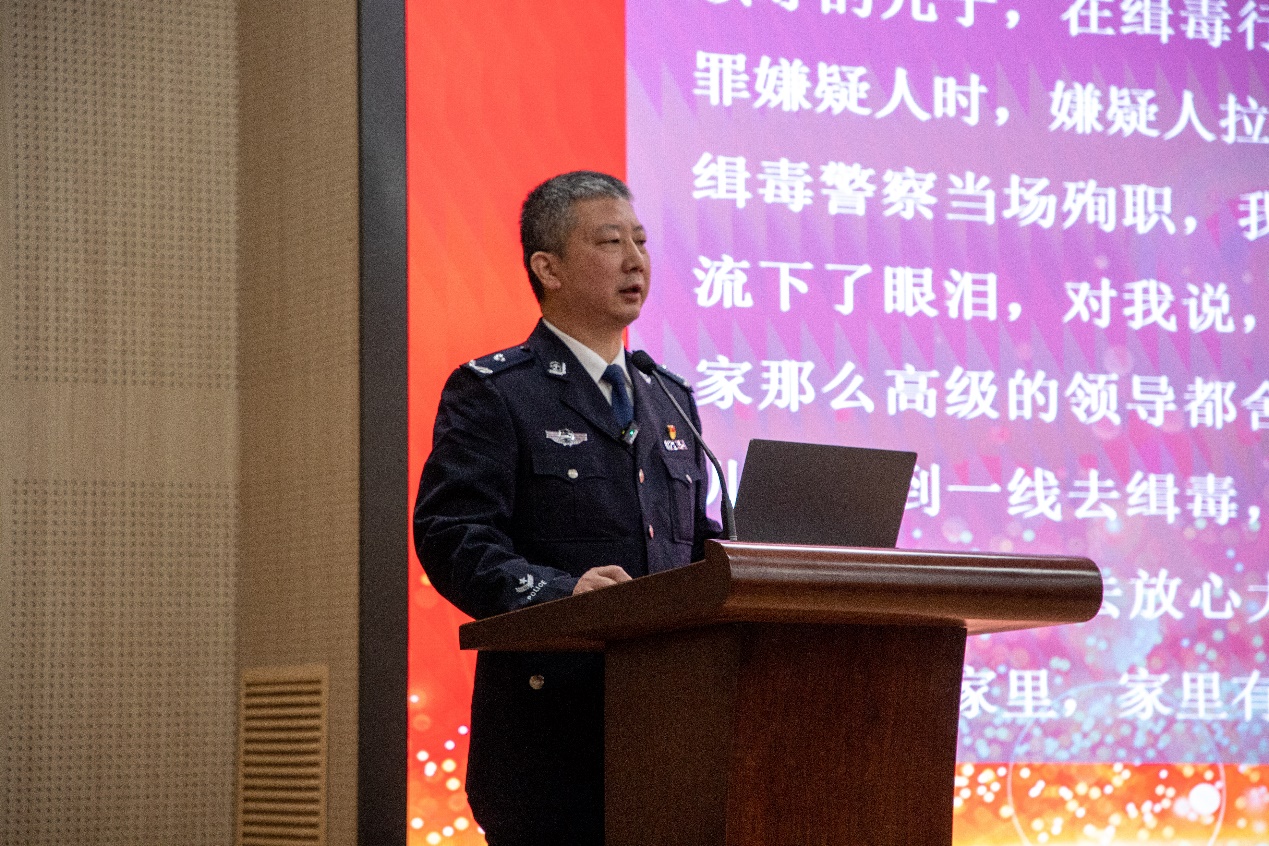 青岛西海岸新区禁毒办主任、开发区分局党委委员、副局长丁伟,新区禁毒办副主任、开发区分局禁毒大队大队长曹友龙,开发区分局二级高级警长王弘山,学院党委书记陈灵泉,学校党委学生工作部副部长张程,学校保卫处副处长苏兴出席;学院党委副书记郭杰主持此次活动。