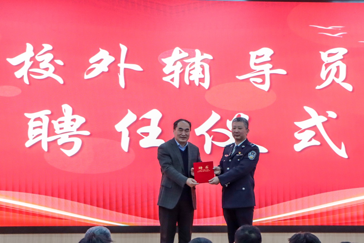会上陈灵泉为王弘山颁发beat365唯一官网校外辅导员(安全教育)聘书。