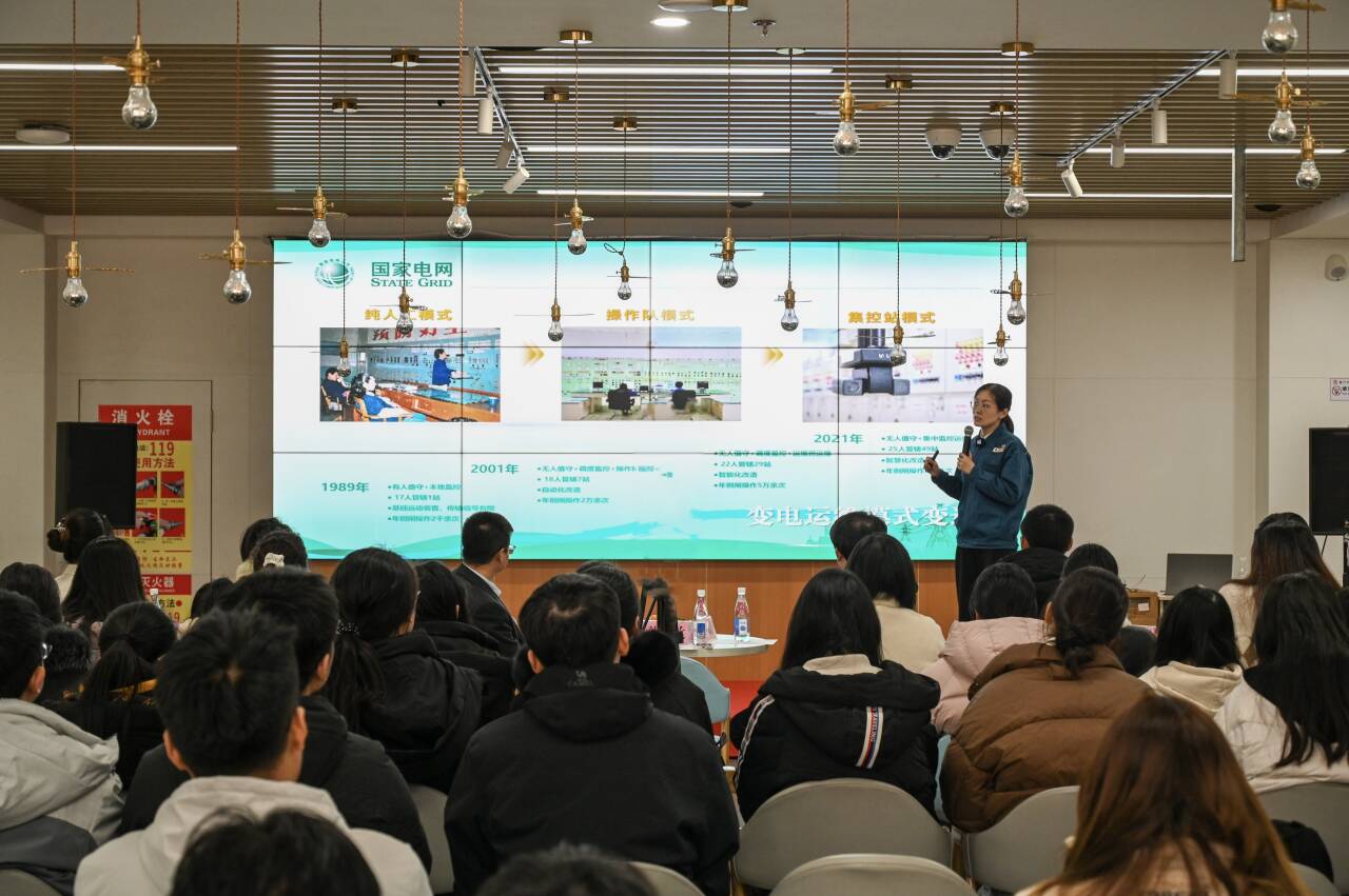 孙晓兰从“坚决扛牢保供责任”“勤于思考,敢于创新”“担当有为,做就最好”三个方面,面向电气专业学生进行讲述。她以国网青岛供电公司在上合组织青岛峰会保电任务为例,通过分享期间提出的“六个零”工作目标、“五个最”工作要求等,展现出电气行业工作者以最严密的组织措施、最科学的保电方案、最高的可靠性,保证“亿万分之一也不失”的匠心坚守。提及变电运维工作,孙晓兰表示:“工作不难,难的是干一辈子运维工作不出差错,任何时候不要敷衍了事不马虎大意,不讲标准不打折扣,这样才能保证安全生产也是做任何事情的基础”,并鼓励在场学生“以十年磨一剑的韧劲,以‘一辈子办成一件事’的执着,攻关高精尖技术,成就有价值的人生。”