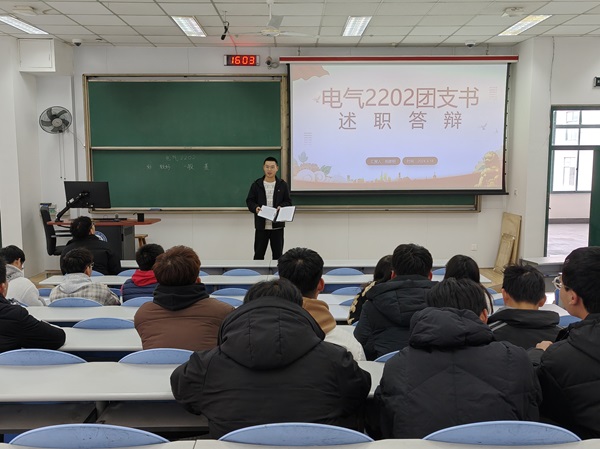 为响应学院团总支号召,及时总结大二学年第一学期团支部工作内容,为团支部下一步发展奠定主方向,电气2202团支部于3月18日下午在讲堂群西环307教室召开团支书述职答辩会议。本次会议由电气2202班长王嘉主持,beat365唯一官网2022级辅导员骆浩冉、2022级年级团总支宣传委员褚荣天、文体委员刘旭周出席本次会议,团支部全体成员参加。