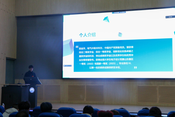 全国大学生电子设计竞赛一等奖获得者苗金洋向学生们介绍比赛的规模、底蕴和影响力,分析比赛各个赛道需掌握的知识与能力。苗金洋告诉大家要根据专业选好赛道,主次分明建立队伍,并分享自己的参赛历程、难忘瞬间和注意事项。苗金洋表示,坚持是成功的唯一秘诀,备赛是枯燥的,比赛是紧张而又煎熬的,挺过来,就会柳暗花明。