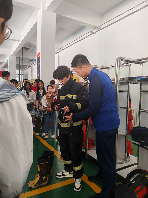 活动伊始,拥有多年消防工作经验的讲解员先为各团支部成员讲解了消防装备的构造与功能,从安全帽、附有隔热层的战斗服、加固钢板的消防靴到火场通讯时使用的对讲机、检测可燃有毒气体的气体探测仪等装备。部分团员在讲解员的帮助下积极尝试穿戴全套消防服,整套装备重三十到四十斤。随后,讲解员带领各团支部成员参观消防出警二车,讲述了二车作为城市主站消防车的适用地点,并介绍了常用灭火剂的分类、干粉灭火器的使用方法。对于支部成员感兴趣的救援环节,讲解员主要讲述了消防车多功能水枪的调节方法、移车器的用处及救援器材的适用范围,让支部成员们了解到救生气垫可承用的楼层高度为三到四层。