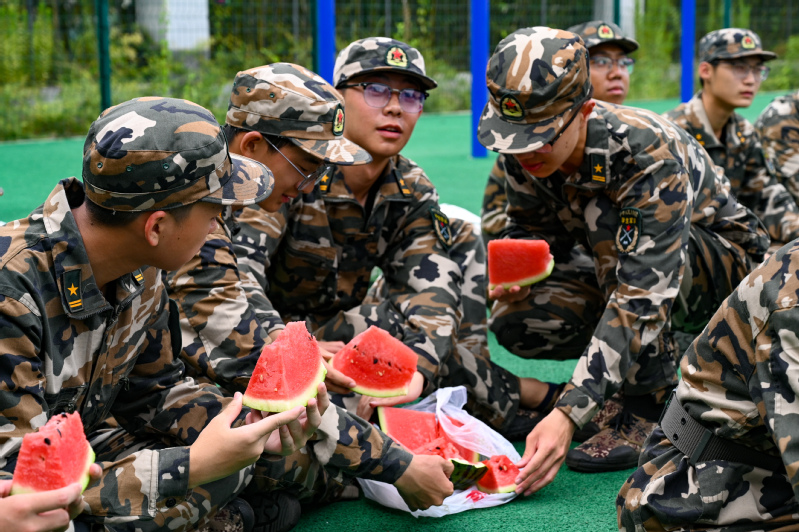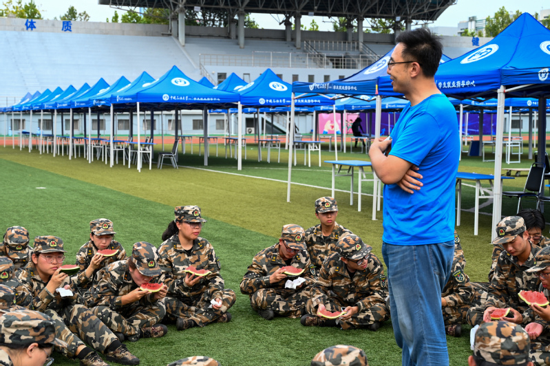 在教官的带领下,新生们身着戎装,以整齐标准的军姿迎接各领导老师的到来。马文忠向全体带训教官致以亲切慰问,对军训营近期取得的显著训练成果给予了高度评价。他寄语全体新生,要珍惜军训机会,保持积极向上的态度,严格遵守纪律,听从教官指挥,通过军训的磨砺,不仅提升自我体能与意志品质,更要增强集体荣誉感,展现出新能源学子的卓越风采与良好精神风貌。随后,学院为军训教官发放精心准备的慰问礼品,希望教官们再接再厉,圆满完成军训教学任务。最后,各系教师代表向本专业学生发放西瓜等慰问物资,并与学生们亲切交谈,分享自己的成长经历与职业感悟,激励学生们在军训中锤炼意志,勇往直前,同时耐心解答了学生们关于专业发展方向、就业前景等方面的疑惑,为学生们的未来规划提供了宝贵的建议。