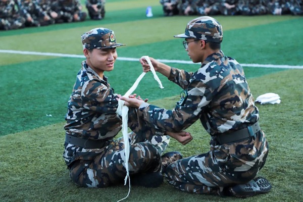当天下午,学院安排了急救训练内容,教授新生们基本的急救知识和技能,提高了他们的安全意识和自我保护能力。军训期间,学生进行高强度的体能训练,容易发生意外伤害。掌握急救技能能够及时处理这些突发事件,保障军训活动的顺利进行。军训急救不仅是一项重要的生存技能,也是培养学生综合素质的有效途径。通过急救培训,学生能够在面对紧急情况时更加冷静和有效地采取行动,为自己和他人的生命安全提供保障。