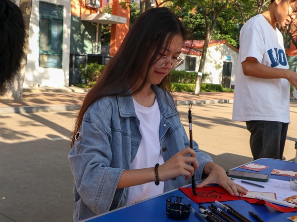 本次活动主要有“书法寄情”与“心愿卡载梦”两部分。活动过程中,学生们拿起毛笔,在特制的宣纸上写下对祖国的深情寄语,表达出自己对祖国最真挚的祝福。此外,活动现场也放置了心愿卡片供学生书写自己的梦想与愿景。这些卡片设计精美,学生们写的既有对祖国悠久历史和灿烂文化的赞美,也有对未来发展的美好憧憬和坚定信心。学生们用真挚的情感和生动的笔触,表达了对祖国的无限热爱和崇高敬意。这些心愿卡片被收集并展示在展板上,吸引众多师生驻足观看,共同感受这份对祖国的热爱与希望。活动在欢欣热烈的氛围中圆满结束。师生们纷纷表示,此次活动不仅让他们感受到了浓厚的节日氛围和爱国情怀的熏陶,更激发了他们为实现祖国繁荣富强而努力奋斗的决心和信心。