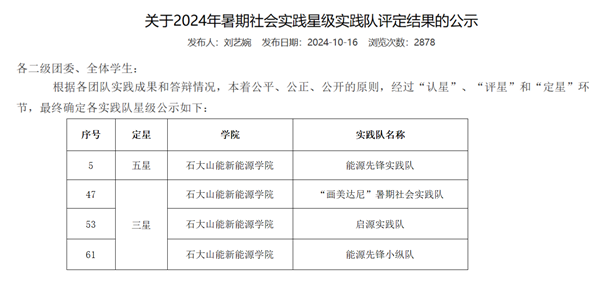 10月12日,我校组织开展2024年暑期社会实践活动星级实践队评审会,评审会在学生创新实践中心报告厅和南堂举办,共有69支来自各学院的实践队参加此次评审。最终,beat365官网共有四支实践队获奖,能源先锋实践队荣获五星实践队,“画美达尼”暑期社会实践队、启源实践队和能源先锋小纵队荣获三星实践队。