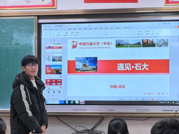 活动伊始,实践队通过播放学校的招生宣传片,全方位展示了中国石油大学(华东)的校园风光和招生计划。现代化的建筑与优美的自然景观相得益彰,瞬间吸引了同学们的目光,让他们对中国石油大学(华东)的校园环境有了直观的了解和深刻的印象。随后,宣讲队详细讲述了中国石油大学(华东)自1953年建校以来的辉煌历程,从北京石油学院起步,到石油大学,再一路发展成为“双一流”建设高校,其深厚的历史底蕴和卓越的办学成就让同学们赞叹不已。