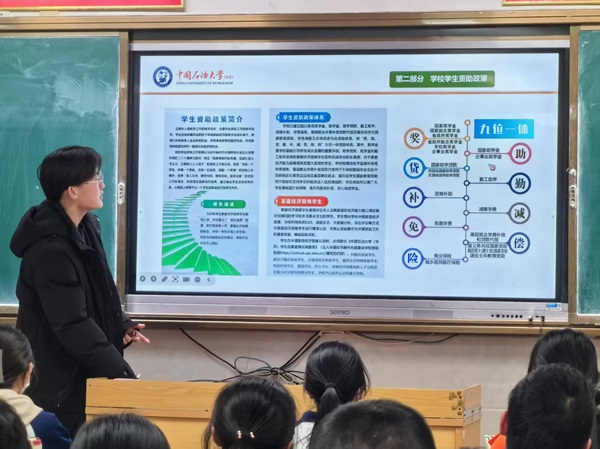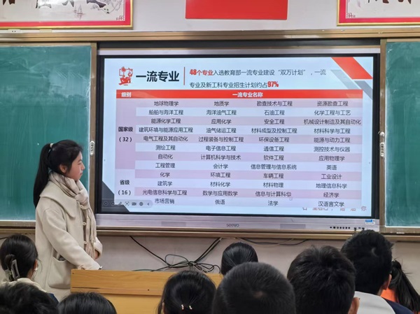 在宣讲队所设置专业介绍环节,地质资源与地质工程、石油与天然气工程等优势学科的展示更是将活动推向了高潮。宣讲队凭借顶尖的师资力量、前沿的科研成果和丰富的实践机会,向同学们展示了中国石油大学(华东)在能源领域的强大实力和独特魅力,让同学们对未来在该校的专业学习充满了向往和期待。此外,更让同学们感到兴奋的是,实践队还分享了中国石油大学(华东)多姿多彩的校园生活,各类社团活动、学术竞赛及文化节等活动的介绍,包括宣讲队员自身的一些经历与感受,更加真实地展现了我校丰富多元的校园文化氛围,进一步激发了学生对大学生活的憧憬和向往。