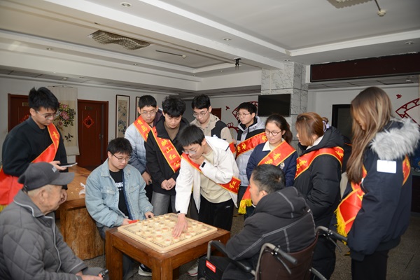 汇演结束后,学生们开展了多个互动专区,实现精准关怀。棋艺区内,青年学子与老人们展开象棋博弈,在“车马炮”的碰撞中传递智慧与默契;故事角中,学生们专注倾听九旬长者讲述往昔岁月,从修建水库的艰辛到时代变迁的感慨,形成跨越数十年的精神对话;清洁组成员手持消毒器械,对走廊扶手、电梯按钮等高频接触区域进行深度消杀,细致的服务赢得护工人员的连连称赞。