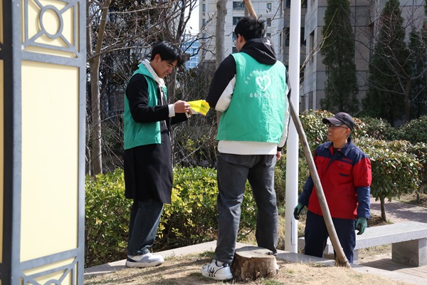 当日,团员们准时集合,在新能源2301班长张超然的组织下,大家有序领取工具,两人一组,迅速投入到为小区周边绿化带浇水的任务中。尽管初春的天气还带着一丝寒意,但团员们的热情却丝毫未减。随后,团员们发挥创意,精心设计了许多标有“爱护树木,从我做起”“保护绿色生命,守护美好家园”等温馨提示语的警告牌,并将它们树立在显眼的位置,提醒过往行人关爱树木,共同维护绿色环境。为了给树木提供更全面的保护,团员们还细心地为树木缠上了防虫胶带,保证胶带紧密贴合。有经验的成员主动向大家分享防虫知识,讲解防虫胶带的原理,让成员们在志愿服务活动中了解了更多知识。