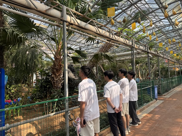 作为国家4A级旅游景区和农业科技示范窗口,菜博会集中展示了全球领先的蔬菜种植技术、数字农业成果及绿色生产模式。实践队逐一走访了各主题展馆,重点考察了四号馆与八号馆。四号馆以一天零一夜精灵丛林艺数馆为主题,集中展示400余种沙漠植物和130余种热带雨林植物。实践队成员被姜山玉米龙等植物造景艺术震撼,这些由南果北种技术培育的奇观,打破了地域气候限制,展现出设施农业的强大潜力。馆内运用VR技术打造的一带一路自然人文景观,更让队员们体验到农业+文旅跨界融合的创新模式。在八号馆绿播九州主题展区,实践队系统学习了寿光蔬菜产业向全国输出的技术体系。通过蔬菜挂果、扦插等艺术手法复刻的八大区域特色景观,生动呈现了无土栽培、立体种植等40余项核心技术。队长张宸绪表示:在'双碳'目标下,探索能源技术与智慧农业的协同创新,正是我们此行的核心课题。