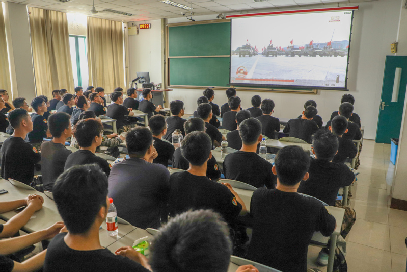 军训新生在教室观看阅兵式 杨恒康摄