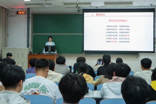 随后,组织建设中心杨思楠围绕团务工作核心内容展开详细讲解,并分享智慧团建和团委系统操作规范与技巧。针对新生线上部落尚未建立的问题,杨思楠提出“高年级团支部与新生团支部联办活动”的解决方案,建议通过主题共建等形式,帮助团支书快速熟悉工作流程,推动新生支部步入正轨。最后,她从思想引领、支部基础活力提升、团务手册规范填写三个关键维度,结合实际案例进行系统性讲解,为新任团支书提供了具体可行的工作指引,助力其高效开展支部工作。